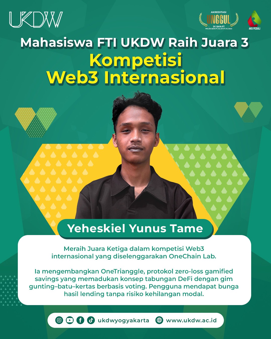 Dunia teknologi kembali menyoroti inovasi anak bangsa. OneTrianggle, sebuah protokol zero-loss gamified savings yang dikembangkan oleh Yeheskiel Yunus Tame, mahasiswa Program Studi Informatika Universitas Kristen Duta Wacana (UKDW), berhasil meraih Juara Ketiga dalam sebuah kompetisi Web3 internasional dan membawa …