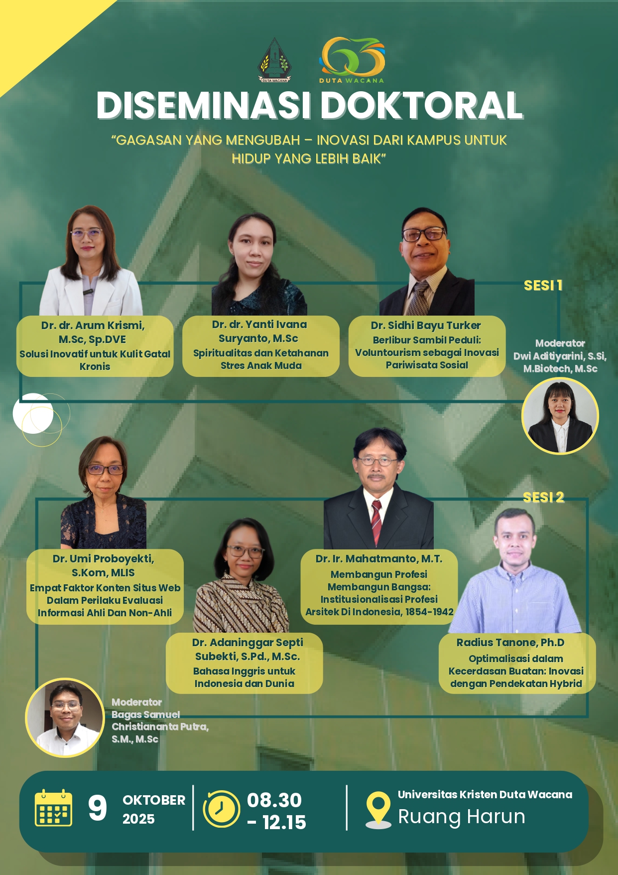 Dalam rangka merayakan Dies Natalis ke-63 Duta Wacana, panitia Dies Natalis mengadakan kegiatan Diseminasi Doktor bagi Dosen-dosen UKDW yang baru menyelesaikan studi doktoralnya. Selain sebagai wadah untuk melestarikan budaya berbagi pengetahuan, tujuan kegiatan ini adalah untuk membuka peluang kolaborasi penelitian …