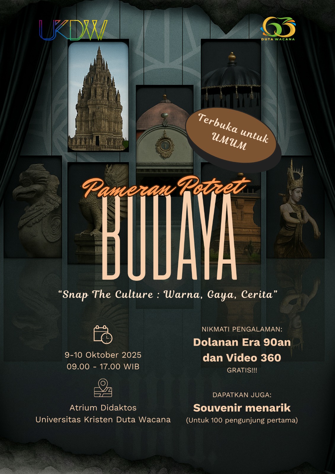 ๐ธ โSnap The Culture: Warna, Gaya, Ceritaโ Nikmati perjalanan budaya Indonesia lewat potret visual yang memadukan keindahan, cerita, dan gaya dari Budaya Jawa! ๐ Rasakan nostalgia dolanan era 90-an dan pengalaman video 360ยฐ yang seru! ๐ Dapatkan juga souvenir menarik …