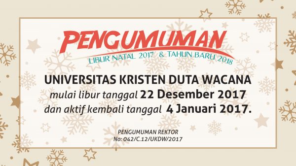 Sehubungan dengan Hari Raya Natal 2017 dan Tahun Baru 2018, kami informasikan bahwa Universitas Kristen Duta Wacana akan mulai libur tanggal 22 Desember 2017 dan akan aktif kembali tanggal 4 Januari 2017.