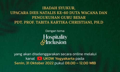 Universitas Kristen Duta Wacana (UKDW) Yogyakarta akan menggelar Ibadah Syukur, Upacara Dies Natalis ke-60 Duta Wacana, dan Pengukuhan Guru Besar Pdt. Prof. Tabita Kartika Christiani, Ph.D. secara live streaming pada: