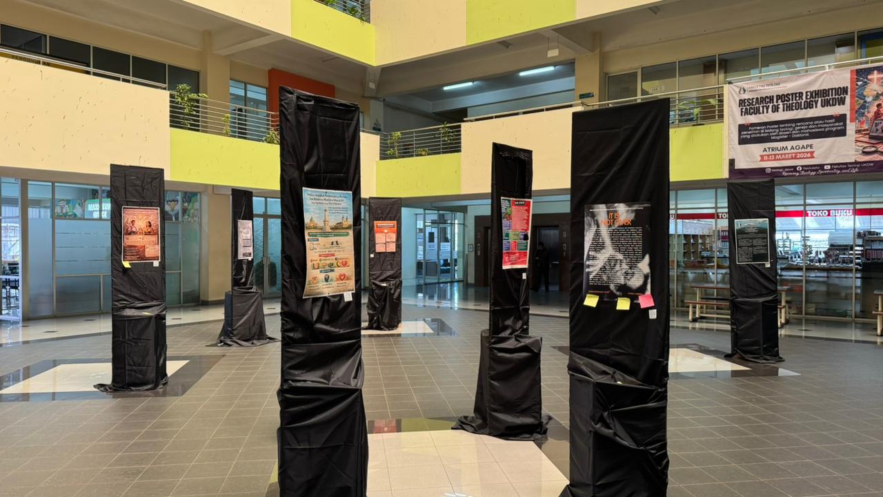 Fakultas Teologi Universitas Kristen Duta Wacana (UKDW) Yogyakarta menggelar Research Poster Exhibition di Atrium Agape pada 11–13 Maret 2026. Pameran ini menampilkan berbagai rencana maupun hasil penelitian di bidang teologi, gereja, dan masyarakat yang dilakukan oleh dosen serta mahasiswa program pascasarjana Fakultas Teologi UKDW.