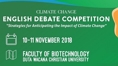 Sebagai bentuk upaya sosialisasi perubahan iklim serta bentuk pembinaan pada generasi muda khususnya siswa SMA, Fakultas Bioteknologi Universitas Kristen Duta Wacana (UKDW) akan menyelenggarakan kompetisi “Debat Bioteknologi 2018” dengan mengangkat isu perubahan iklim