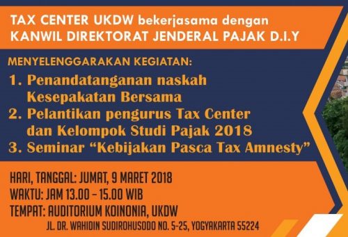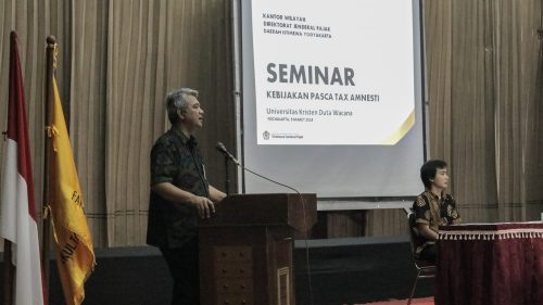 Bertempat di Auditorium Koinonia UKDW, pada hari Jumat (9/3) diadakan seminar “Kebijakan Pasca Tax Amnesty”. Materi seminar tersebut disampaikan langsung oleh Dionysius Lucas Hendrawan, S.E., M.Si. selaku Kepala Kantor Wilayah Direktorat Jendral Pajak DIY dan dimoderatori oleh Frista, S.H., S.E., M.S.Ak selaku Ketua Tax Center UKDW 2018.