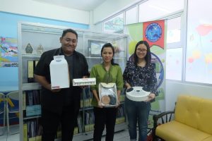 Kepala Design Center Program Studi Desain Produk, Marcellino Aditya Mahendra, bersama Centaury Harjani salah satu dosen Program Studi Desain Produk Universitas Kristen Duta Wacana (UKDW) menyerahkan bhole, puppy bulary, tower o’clock, dan caraka kepada Kepala Sekolah Budya Wacana
