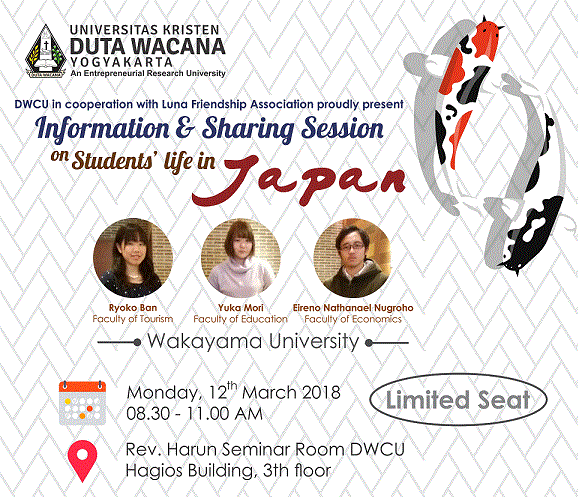 Biro Kerjasama dan Relasi Publik Universitas Kristen Duta Wacana (UKDW) bekerja sama dengan Luna Friendship Association (LFA) menggelar acara Information & Sharing Session on Students’ Life in Japan pada hari Senin (12/3) lalu di ruang seminar Pdt. Dr. Rudi Budiman. Acara ini dimaksudkan untuk mengenalkan kehidupan mahasiswa di Jepang.