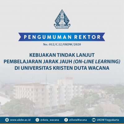 Dalam rangka mengantisipasi berbagai situasi kondisi yang mungkin terjadi akibat wabah virus Covid-19, Pimpinan Universitas Kristen Duta Wacana (UKDW) Yogyakarta memperpanjang pemberlakuan metode pembelajaran jarak jauh (PJJ/online).